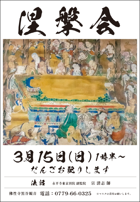 黒谷観音では3月15日(日)午後1時半よりお涅槃会です。